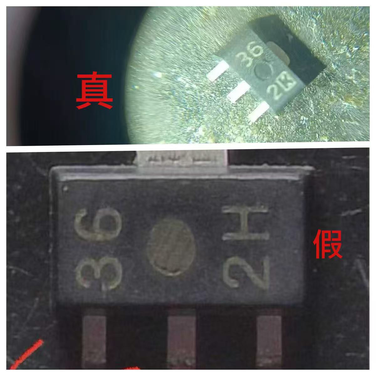 不少原激光印字的打磨翻新片(功率器件居多)因要去除原标记,必须打磨较深,如此器件的整体厚度会明显小于正常尺寸,但不对比或用卡尺测量,一般经验不足的人还是很难分辨的,但有一变通识破法,即看器件正面边沿。