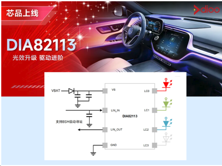 DIA82113基于 32位Arm® Cortex®-M0+内核,集成了高精度恒流源、LIN通信接口与智能控制逻辑,仅需极简外围即可实现对单颗RGBW LED的独立精准调控。其核心突破在于 四通道独立架构:相比传统三通道RGB混白方案,新增的专用白光通道不仅消除了色温偏移问题,更在同等功耗下提升白光亮度超50%;而R/G/B三路则专注于饱和色彩输出,配合 16位PWM分辨率,实现从深灰到浅粉的平滑过渡,真正达成“专业级白光 + 高保真色彩”的双重目标。